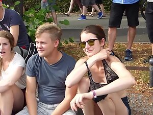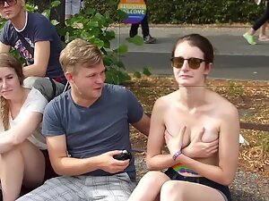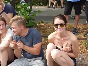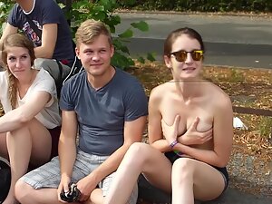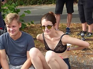 Somehow this funny girl removed her bra during the party and she made sure to immediately cover her tits while sitting and resting with her friends. She didn't consider that her friend will try to tickle her in order to see her naked tits once again. However, voyeur did manage to see her tits, in the moment when she was putting her bra back on.