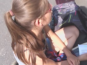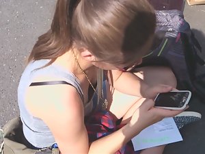 This adorable schoolgirl was sitting down on the floor, talking with her classmates. I was casually standing above her and pretending to be doing something, while in reality, I was peeping down her shirt, straight into slightly exposed breasts. She has a yummy pair of small tits.
