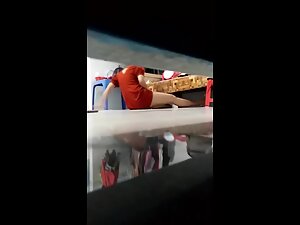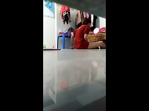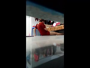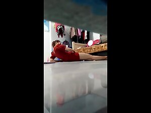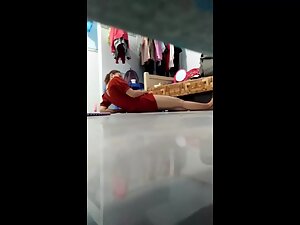 She is comfy on the floor, with her red dress slightly raised and with her hand venturing inside her panties. Her cousin peeps under the door to see her masturbate and she never realized that her orgasm is caught by camera and lustily observed.