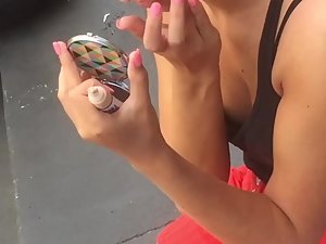 This blonde sweetheart is constantly fixing her makeup while talking to her friend and she is so focused on herself in the mirror that she didn't notice a voyeur next to her. Voyeur is there solely to pepe inside her blouse, because of a visible nipple slip situation she is having. Her puffy nipple is totally visible from this angle.
