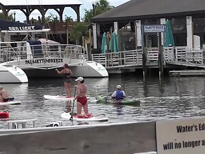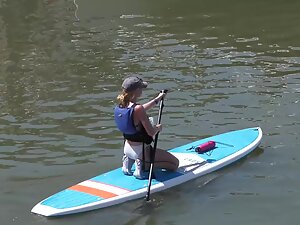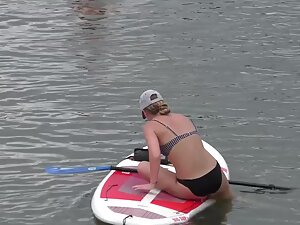 If you ever tried climbing the surfboard, you know how difficult it is. If you didn't try it, you'll see it on this voyeur video. One way or another, you'll be pleasantly surprised how nicely she does it but you'll also love seeing her wiggly ass while she climbs and the little bit of pussy slip that happens while she is in the middle of it.