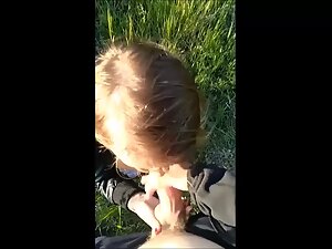 These two are fucking like two rabbits in heat, on the most beautiful place ever. Huge green meadow is all around them and flowers are everywhere, and they to the most natural thing possible. She sucks his dick and then stands up so that he can fuck her real quick. She kneels back down to take his cum in her mouth and she proudly shows it to the camera.