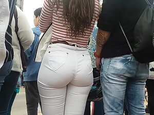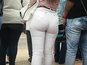 Getting close and admiring how nicely her royal ass fills up those white jeans is more than lovely. She is standing there with her boyfriend and her narrow waist really makes her royally wide ass cheeks stand out even more. Voyeur got super close to see all the sexy potential of her sweet bubble butt.