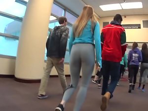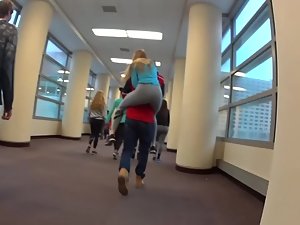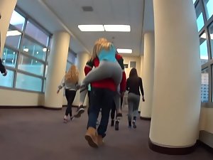 Silly schoolgirl is running through the school corridor and jumping on boys from her class to get a piggyback ride. That also means her tight ass in gray spandex becomes fully exposed when she straddles them. I bet that in college she'll be jumping on hard dicks with the exact same passion.