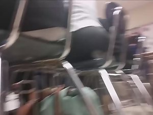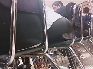 I guess she was so much into this class that she arched her body forward, meaning that she was actually sitting on her own feet on that chair in classroom. I peeped on her wonderful arching ass in tight black pants and then I filmed her face when she turned around.