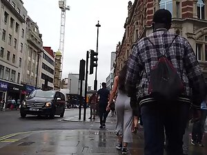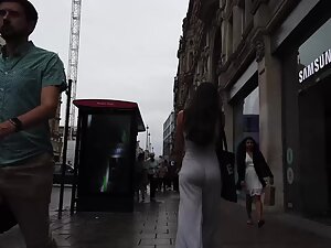 Her grey onesie with loose fashionable pants is practically made to show off how nicely she wiggles her pretty ass when she walks. Voyeur is following her on the street and it is easy to get lost in sexy thoughts while watching and admiring her sensual booty.