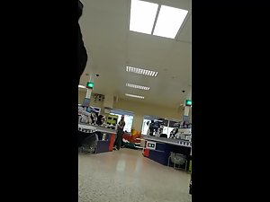 This girl is probably well used to being noticeable, for her hotness and unique style. Voyeur notices her in the supermarket, with her boyfriend, and he still makes a few circles around her petite body. She got a stunning face with long blonde hair, a sexy tattoo on her shoulder and an impressive ass in tight leggings. Her black tights squeeze her ass to the point where her thong becomes visible.