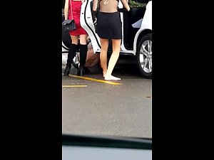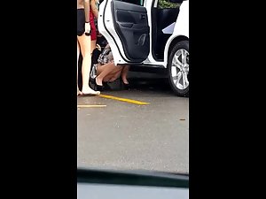 Group of super sexy girls, dressed in miniskirts and high heels, stopped their car to take a piss by the highway. They were squatting down and pissing, one by one, and the other girls were trying to block the view by standing guard next to those that pee. They didn't see I'm spying on them from the opposite side and I had the most amazing view of them while they pee.