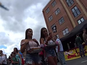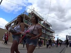 These two girls are selling trinkets on the streets and I wish they were selling themselves. Both of them are hot, tanned and looking sexy in their jeans shorts. I followed them around and I did a circle o make a video of everything, from their pretty faces all the way to their butts.