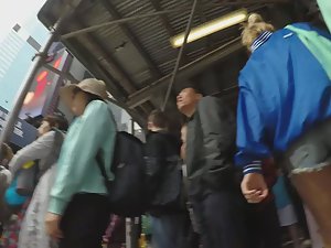 I'm following this blonde and constantly admiring her tanned sexy legs. Every now and then I had a good view up her shorts and it felt almost like an upskirt, because lots of her naked ass cheeks were in full sight. It is simply amazing to see how those denim shorts end up deep in her ass crack.
