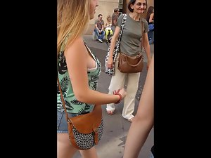 It is just immeasurable on how nicely her big boobs peek out of her shirt. She is apparently without a bra and her entire sideboob is visible, specially when she stretches her arms. She is smiling while talking with her friend and she is utterly clueless that a voyeur is trailing them with his candid camera aimed directly at her boobs.