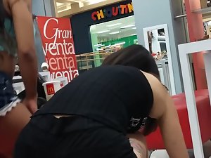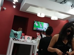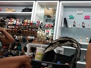 It is hard to be sure which one is the milf of these two latina sluts but they are both dressed like total sluts, that much is easy to conclude. Voyeur keeps the focus of his candid camera on the slut with the tattoo on her thigh, because her outfit is way more revealing. She is trying new high heel shoes in the shopping mall and you'll see her big tits when she leans down. Her body is built like a curvy hourglass.