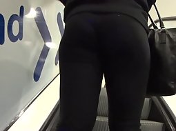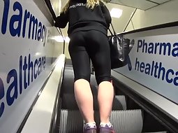 Voyeur was riding the moving stairs right under a very hot girl in knee long tights. He decided to film her from that angle and you gotta admit you like the way she fills out those leggings. She has a big firm ass.