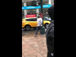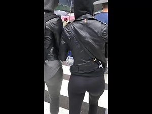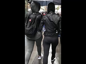 It is a crappy rainy day but having her athletic ass in front of you will immediately boost your mood. She walks under her friend's umbrella and a voyeur is following, to see more and more of her tight sporty ass in black leggings. Voyeur caught a nice glimpse of her pretty face, despite the fact she is wearing a hoodie.