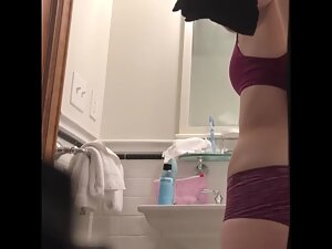 She is fully naked in the bathroom, in the process of removing her makeup and washing her face, and she unknowingly does it directly in front of the hidden camera. She is very skinny, with small tits, and her pussy got a lovely neat pussy hairstyle. She looks like a cute tomboy beacuse of her short hair.