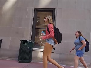 This is what a dedicated voyeur does when he finds a stunningly sexy schoolgirl. He followed and peeped on her at three different occasions. She was wearing shorts each time, twice it was denim ones and once it was soft cotton shorts before gym class. You'll recognize it's the same leggy schoolgirl because she has the same backpack in all three occasions.