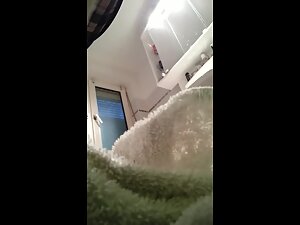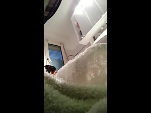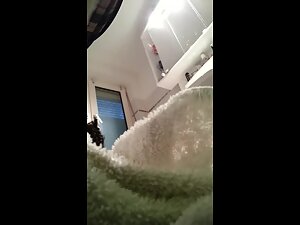 Hidden camera is nicely positioned in the bathroom, just right to see the voyeur's sister when she gets naked and stands in the middle. You'll see everything, from her face and body all the way to closeup of her ass and hairy pussy lips when she stands directly above the hidden camera.