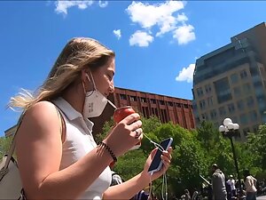 That short skirt is practically showing upskirt on its own, without any effort needed by the voyeur. Her squishy bubble butt cheeks are popping out of upskirt and voyeur simply had to follow and keeps his camera pointed at her back end.