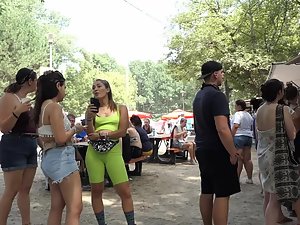 Festival location is packed with hot girls of all shapes and sizes and the voyeur managed to stumble upon the most interesting one. This party girl is short and muscular, and she shows off her strong sexy body in fluorescent green outfit. That tight outfit puts her strong legs and meaty ass on full display, as you'll see throughout the video that voyeur made while following her all over the place.