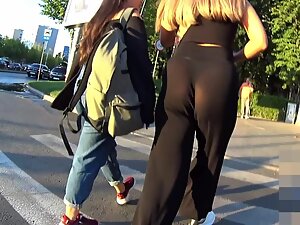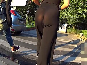 She looks classy and pretty in those loose black pants, at least when she isn't standing in direct sunlight. Sunshine makes those thin pants become transparent and voyeur easily follows the trail of her adorable ass and tiny thong.