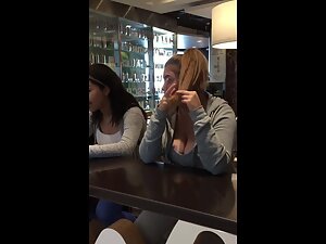 This interesting girl's boobs are so big that she literally leans them on the bar counter at a coffee shop. She is talking to her friend and she seems suspicious, as if she senses that a voyeur is checking out her big boobs and cleavage while she is in that pose.