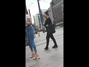 This tall hottie looks stunning in her jeans, almost like she is trying hard to look like a supermodel at every possible moment. She is standing with her friend and that gives enough time to the voyeur to check her out from all sides. Her endless legs look fantastic in such tight jeans and high heels.