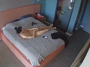 She is fully naked and sticks that vibrator in her pussy in hopes of a good time but someone keeps texting her and interrupting her masturbation time. She gets a small orgasm and then rushes to answer on the phone. Hidden camera caught this interrupted horny time in her bedroom.