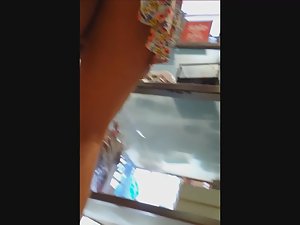 Hottie waits in the store and her skirt is so short that voyeur simply stands next to her and gets to see her yummy ass in upskirt. Her ass is thick enough to totally hide her thong in the crack and it would be delicious to pluck it out, if given a chance.