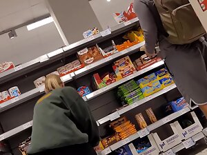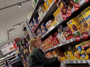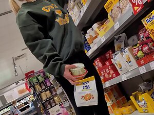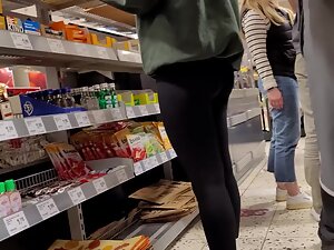 Her black leggings aren't leaving anything to the imagination and you'll be thinking of her naked ass in no time. Leggings are all the way inside her crack and her tight buttocks are squeezed like they are gonna pop out of there. Voyeur checks her out from close proximity while she buys food in the supermarket with her boyfriend.