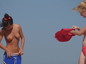 Three girls are on the beach with their boyfriends and all of them are in topless under the afternoon sun. Two of them are protecting their hair from the sun and the petite one looks specially adorable when she does it. She looks like royalty with that white dress waving in the wind from her head.