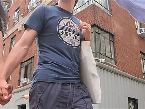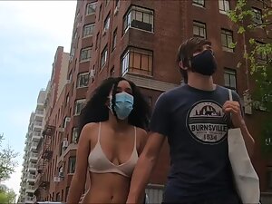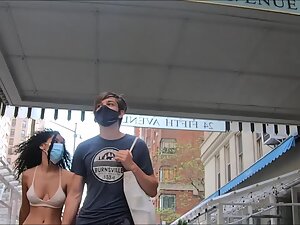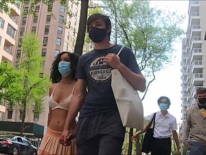 In a way, she looks like an urban version of a hula dancer in that long skirt and tiny top that appears like a bra. This exotic girl got yummy tits and her hard nipples are poking right through. Her white boyfriend is holding her hand and we can only imagine how happy she makes him when they are all alone.