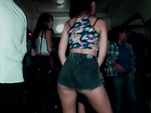 Club is packed and everyone is dancing, but voyeur is focused on one very special girl in front of him. She is dancing in her spot and she does an incredible twerk every now and then, which puts her gorgeous firm ass on full display. When she bends over all the way to shake her little booty, her panties and a bit of a pussy slip become nicely visible.
