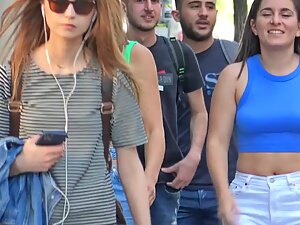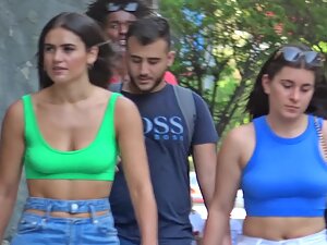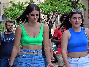These two are sporty and chic at the same time and voyeur is checking out both of them as they walk together. Hottie in green top is beautiful but her friend in blue top is even more interesting because her hard nipples are poking through the fabric.