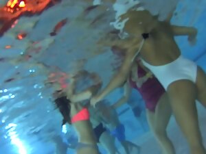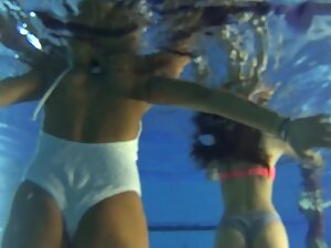These two hot friends are enjoying themselves in the swimming pool and they are always together, which makes it easy for the voyeur to swim after them with his underwater camera. One of them has a perfect round ass while the other got a nice bubble butt with a funny tattoo on one cheek.