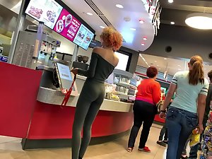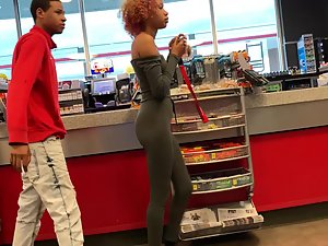 That tight jumpsuit really makes her skinny body stand out and it also emphasizes her little curves. Her boyfriend is there with her and he touches and fondles her whenever he can, so voyeur keeps it discreet in order not to get caught. Her curly orange hair, supermodel kind of body and a terrific gap between thighs under her ass are all making her look unique, specially for a black girl,