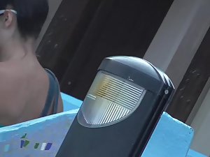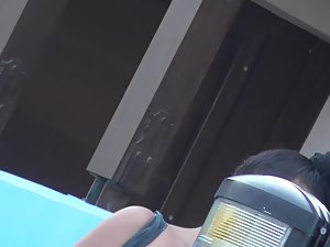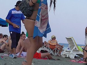 Her tits are tiny but in that unique bikini top they still look like they'll burst out. She is really noticeable with those sunglasses and of course, with a leopard thong that shows off how juicy her butt cheeks are on the beach.