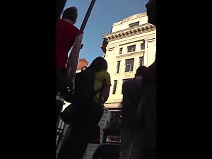 Red color means she wants to be seductive but with her sexual energy, any color would do. This elegant blonde is walking around in high heel stilettos and voyeur is following her until he finally manages to see an upskirt of her royally fine booty.