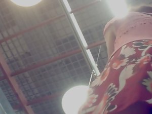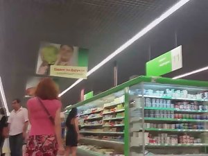 Looks like she was preoccupied with checking out food discounts in the supermarket, so she didn't notice a voyeur closing in on her. He had a nice view between her legs and deep into her skirt. She had a nice thong thing going on down there.