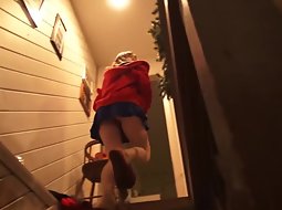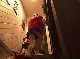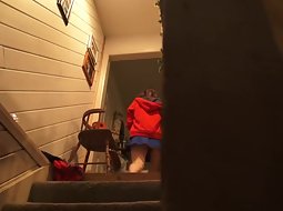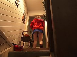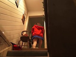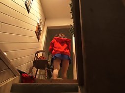 Voyeur was walking behind this girl on the stairs and she didn't suspect anything while she was walking up in that short skirt. Voyeur grabbed that chance and quite successfully saw her round butt and panties.