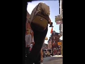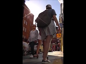 She is walking, eating snacks and looking lovely as ever in that short white dress. Voyeur needed just a minute of discreetly following her to get a sneaky look in her upskirt. She got a sweet plump butt with a nice thong tan line in the middle. Now we know she wears a sexy thong when she goes to the beach.
