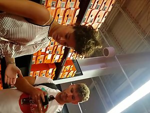 Voyeur just happens to be standing right next to a beautiful girl while she picks new shoes in the store. She bends over to try them on and voyeur is rewarded by her yummy upskirt that shows off her tight ass and sexy panties. You'll see her face in the end and you'll see just how kissable she is.
