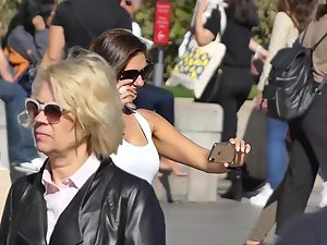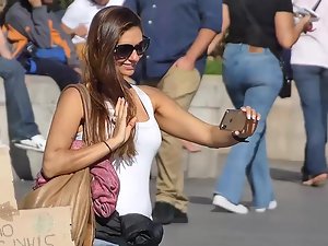 This hot brunette really brings a joyful energy to anyone who watches her, specially to a voyeur that peeps and zooms in on her. She looks hot when she smiles and her tits are majestic in her white shirt. She seems to be pretty happy with herself as well and she snaps selfies all the time in a crowded city square.