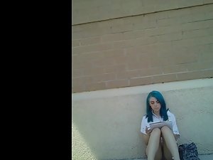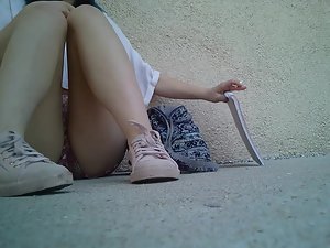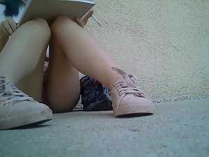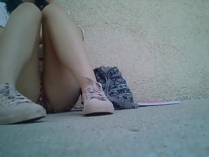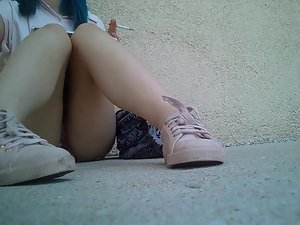 This sexy teen girl isn't a cheapskate and she gladly gave a cigarette to the voyeur that asked for it just to get a chance to point his camera at her crotch. She is sitting with her legs spread and her shorts make her look very inviting. Look closely and you'll notice how her eyes wander back at the voyeur after he was leaving. I think she really liked him, for whatever the reason.