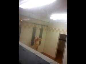 Voyeur finds a way to climb to the window of the female locker room and he gets a good peep inside, right when a curvy naked woman is showering. He checks her out until she finishes her shower and then continues peeping on the other part of the locker room.