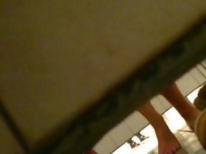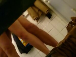 In a way, this curious voyeur ended up directly under a couple having sex. They are standing and fucking in the changing room and he crawls down to peep on them from under the wall. He was so close to actual fucking that he could probably smell her pussy or get splashed by her juices.