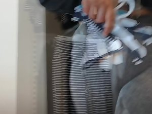 Voyeur has such a good time getting serviced by this chunky salesgirl in the clothes store that he makes it last for longer than needed. He keeps asking her stuff and she shows him everything, along with lots of bending over and wiggles of her meaty ass in grey tights. She is chubby and it looks great on her.