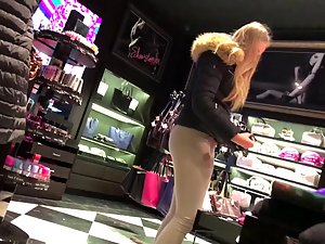 This blonde teen is all over the cosmetics store and voyeur is all over her in the very same way. She looks absolutely beautiful with her long blond hair falling down her jacket and her sexy legs and ass are stunning in those beige tights that she wears. Outline on those leggings is showing off the true perfection of her butt cheeks.