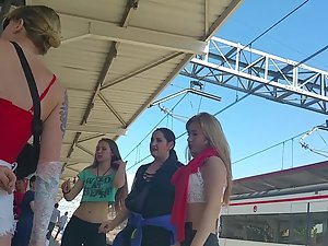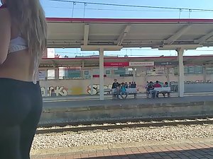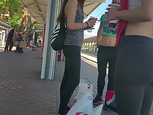 Every girl in this group of teens is a voyeur's dream come true. They are all in tight spandex leggings or shorts and their tight asses are ripe for taking and videotaping. First I thought the hot blonde in black leggings is the best one in the group but then the tattooed chick in shorts appeared and I was once again blown away by the sexiness of her ass. She got multiple tattoos and some of the fresh ones are still covered with nylon. This is the best thing I ever saw on any train station.