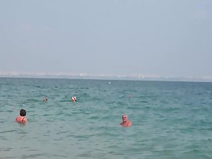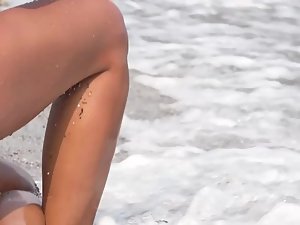 She is sitting in the shallow water and waves are hitting her epic ass in that sexy bikini, while she uses a selfie stick to make some hot instagram photos. Voyeur made sure to videotape her stunning body from every possible angle, without her noticing anything. Seems like she is on the beach with her mother and that isn't stopping her from making sexy photos.
