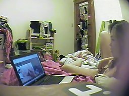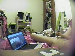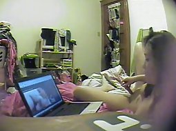 It was a great thing to put a hidden camera in her room, even though I didn't know she masturbates this often. She lied naked on her bed, put some porn playing on her laptop and used a dildo on her tiny pussy.